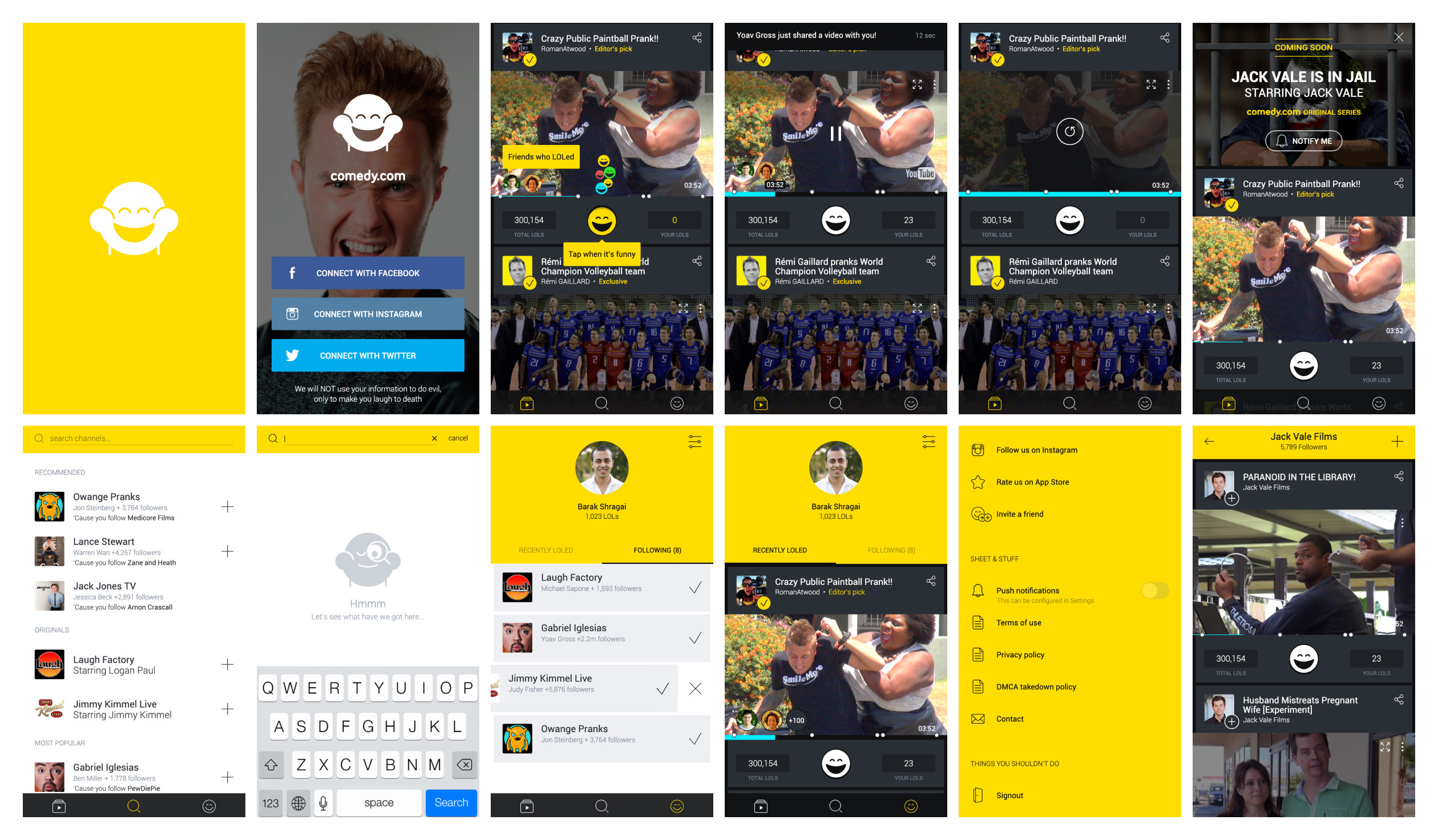The app allowed users to discover, follow, and watch comedic shows and trending videos. It provided options to subscribe to creators, mark favorites, and share content directly, creating a hub for comedy enthusiasts to engage with both content and community.