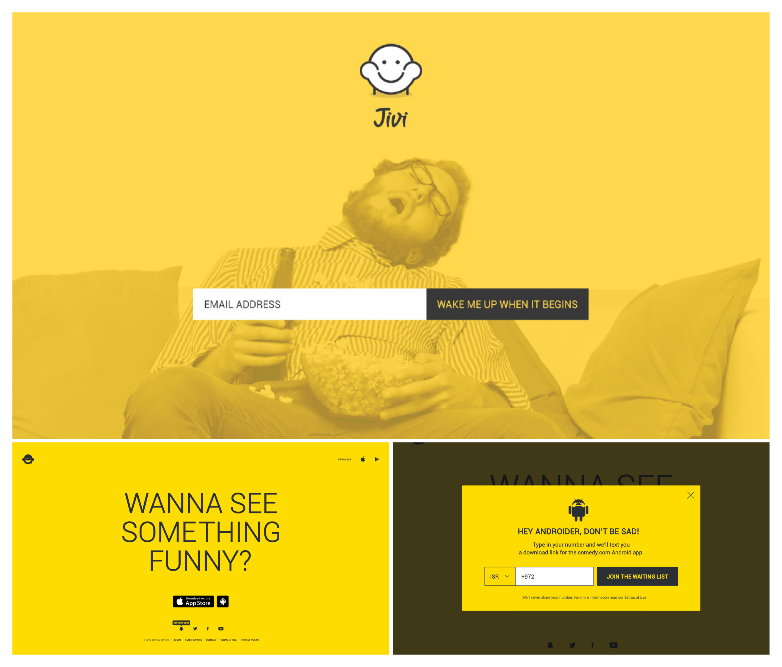 The first stage focused on collecting emails while subtly promoting the brand’s message of life being boring and lacking fun. In the second stage, we directed users to the app store, while playfully adding “tears” to the Android icon since the Android version was still in development. On hover, users were informed of the expected Android release, keeping them engaged and excited.