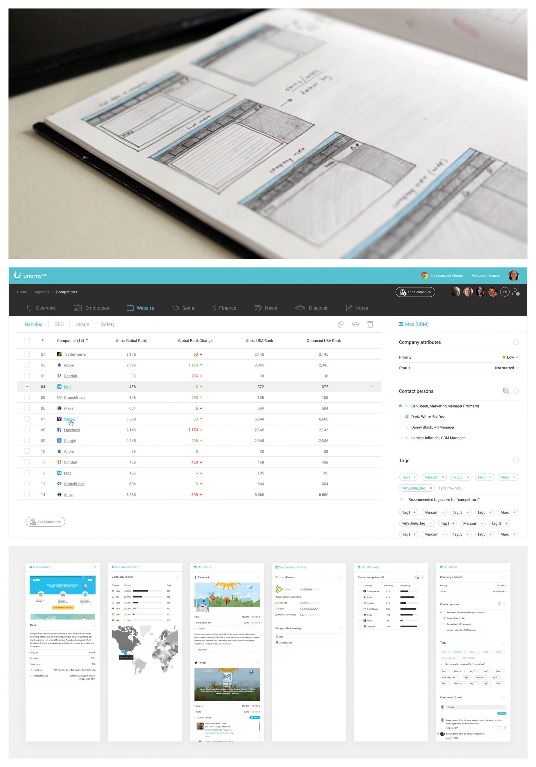 The interface allowed users to discover, track, and analyze competitors, leads, and markets across metrics like website performance, social media, employees, news, and financial data, offering actionable insights for market analysis and business development by aggregating data from multiple sources.
